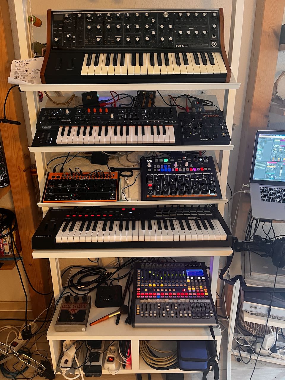 Studio Frank’s home studio Post author By Frank Post date 9. March 2025 From the top down: Moog Sub 37 Arturia MiniFreak Waldorf 12-pole filter Behringer CRAVE Arturia DrumBrute Impact M-Audio Oxygen Pro 49 Electro Harmonix Big Muff PI USA ART Tube MP Presonus StudioLive 16.0.2 USB
